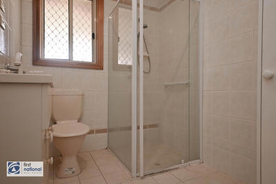 There are three bedrooms, all with ceiling fans. The master bedroom includes a built-in robe and split-system A/C, and bedroom three also features a built-in robe. The bathroom is nicely tiled in neutral tones and includes a handy 2nd toilet, with the main toilet located next to the laundry.